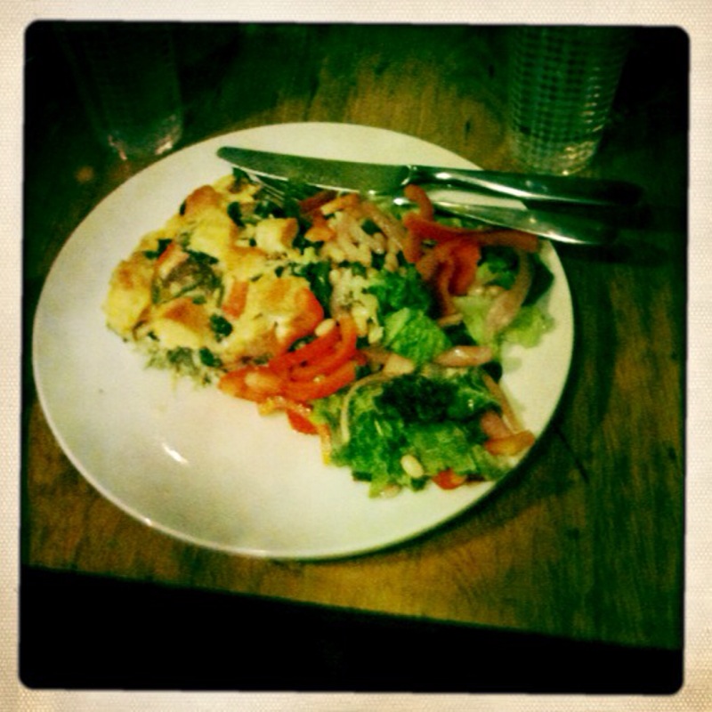 - Stir in the cubed bread, and spinach-tomato mix to the eggs.